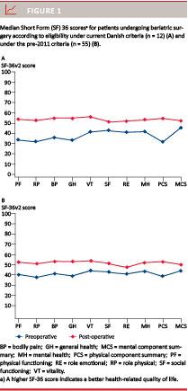 This study assessed HRQOL changes associated with Roux-en-Y gastric bypass with follow-up over an average of 22 months. The aim was to explore whether post-operative HRQOL variations were associated with identifiable socio-demographic or clinical characteristics and, in particular, whether HRQOL changes differed between patients fulfilling the current Danish criteria and patients only fulfilling the criteria for bariatric surgery before 2011.