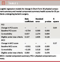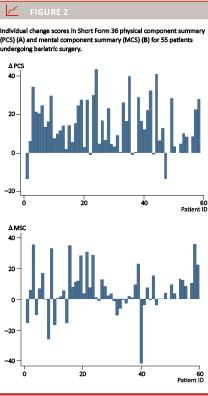Spearman rank correlations were used to investigate the relationship between PCS/MCS changes and age, preoperative BMI, time since operation and baseline PCS/MCS. Surgical eligibility and variables significantly related to PCS/MCS change scores were entered into multiple linear re-gression analysis to test their independent contribution to changes in PCS/MCS. Statistical significance was set at p ≤ 0.05.