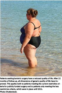 HRQOL improves significantly after bariatric surgery, but individual variations in outcome are often large [5-8]. As gastric bypass is an invasive procedure with an irreversible effect on eating behaviour and in some cases with serious adverse events [9], it is important to identify potential risk factors for poor long-term outcome. In Denmark, bariatric surgery is free of charge for patients fulfilling the Health and Medicines Authority’s criteria, which until 2011 were in line with international criteria [10]. However, in 2011 access to surgery was restricted dramatically, and the annual number of operations fell from 0.9 per 1,000 inhabitants (2010) to 0.2 per 1,000 inhabitants (2012) [11]. The restrictions involved a tightening of the criteria for patients without manifest obesity co-morbidities, which raised the lower body mass index (BMI) threshold from 40 to 50 kg/2 and increasing the lower age limit from 18 to 25 years [11]. It is not known whether patients fulfilling the tighter criteria benefit more from surgery than patients who only met the previous criteria.