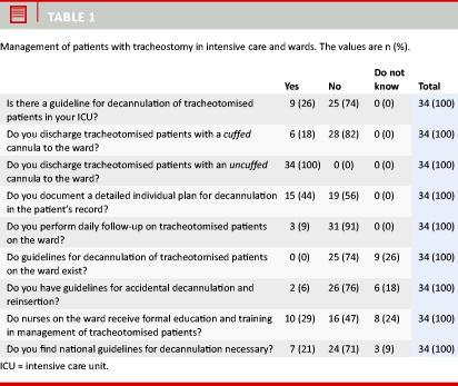 The aim of the present study is to elucidate the management of patients with a tracheostomy in situ at discharge from the ICU to the ward. No published data from Danish hospitals exist on this topic. Our hypothesis was that guidelines are few and that patient management as well as staff education differs widely and that this creates a potential for adverse events in this vulnerable patient population.