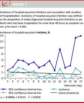 The incidence of HAI in relation to days of hospitalization is shown in Figure 1. The incidence rate ranged from 0% to 3.5%. Test for trend showed that there was no correlation between the duration of admittance and HAI incidence (p = 0.491).