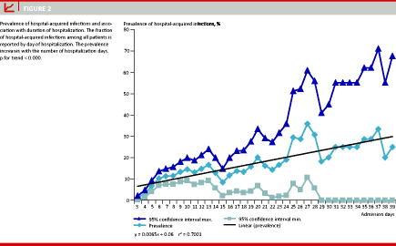 Figure 2 shows the prevalence of HAI distributed on days of admittance. The prevalence increased with the duration of admittance (p < 0.001) by approximately 0.6% per day.