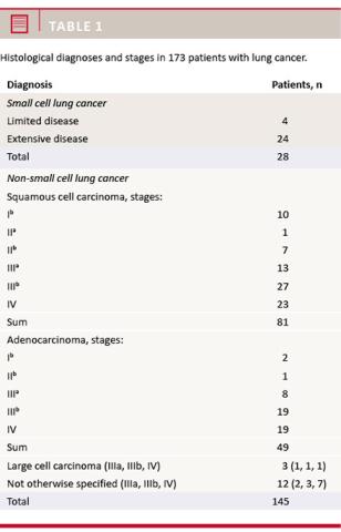 NSCLC was diagnosed in 145 patients (84%); 56% had squamous cell carcinoma, 34% had adenocarcinoma, 2% had large cell carcinoma, and 8% had NSCLC not otherwise specified (NOS). A total of 28 (16%) of the patients had SCLC. Histological diagnoses and stages are listed in Table 1. Of the 28 patients with SCLC, 24 (86%) had extensive disease. Of the 145 patients with NSCLC, 61% were diagnosed with stage IIIb-IV disease.