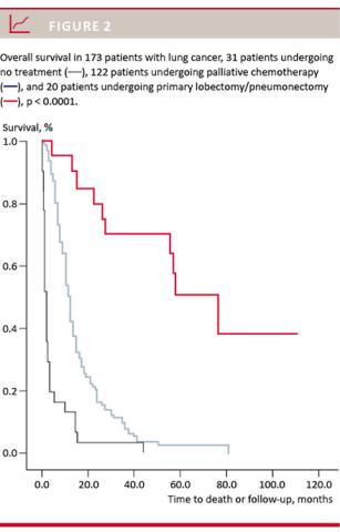 The median survival of patients undergoing primary lobectomy/pneumonectomy, palliative chemotherapy, and no treatment was 76.3 months, 11.8 months and 2.0 months, respectively. The difference between the groups was statistically significant p < 0.0001 (Figure 2).