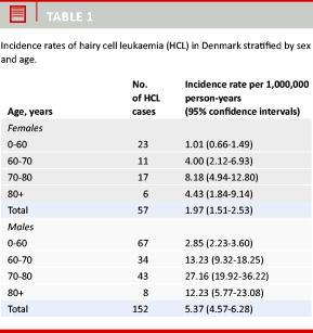 The Danish incidence rates for HCL have not previously been reported. The mean age at diagnosis of HCL in our study was 63.5 years, which is slightly higher than the age reported in most other studies [1, 3, 4, 16]. The reason for this may lie in the population-based nature of our study which included all verified cases in an entire country. Our incidence rates are in accordance with most other studies and confirm the increase in incidence with age and the male preponderance [1-5]. However, it is remarkable that we found a lower female to male ratio than the four-fold increase reported in most other studies [1, 4].