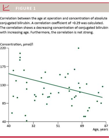 Furthermore, a graphic correlation between the age at operation and the value of the conjugated bilirubin was illustrated. The correlation was quantified using the Pearson Product Moment correlation.