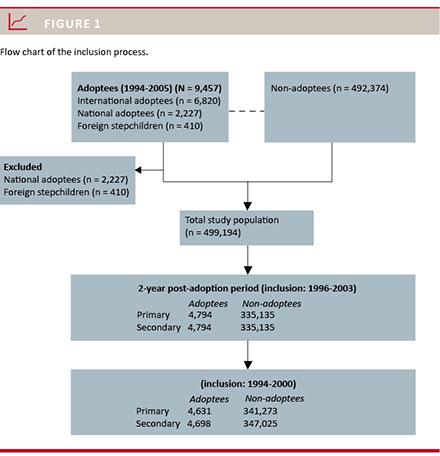 Data on international adoptees were obtained from the Danish Civil Registration System (CRS). In Denmark, adoption status is stated in the CRS along with country of origin [11]. The population in the present study was restricted to all Danish adoptions of children below 11 years of age processed from 1 January 1994 to 31 December 2005. For each included adoptee, the study population was augmented with all non-adopted children who, at the time of the adoption, were of the same sex and age, lived in the same municipality and in similar family constellation (e.g. nuclear family, single parent); this information was obtained from The Danish Family Relations Database which is based on kinship information from the CRS [11]. Next, national adoptees – primarily stepchild adoptions (Figure 1">Figure 1) – were excluded