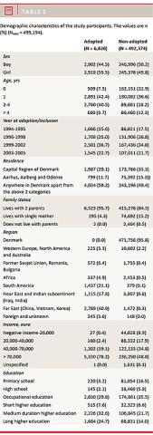 The study population (n = 499,194) consisted of a group of non-adoptees (n = 492,374) and a group of international adoptees (n = 6,820) (Figure 1). Demographic data are shown in Table 1">Table 1. The international adoptees featured more girls (55.5%), while the non-adopted children had an approximately equal gender distribution (49.8% girls). Most of the adopted children were one year (42.4%) or 2-4 year old (40.5%) at the time of adoption. and most of the children arrived from the Far East (e.g. China, Vietnam, Korea) (40.9%), South America (24.0%), or Near East and the Indian subcontinent (e.g. Iraq, India) (18.7%).