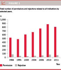 In 2011, the abortion committees received 862 applications for permission to late TOP which is a 9% decrease compared with 2010. Despite this decrease, there has been an overall increase of 45% in the number of applications for permission to late TOP from 1986 until 2011 (Figure 1). The review of the applications from 2011 indicates that the abortion committees rarely gave rejections. Of 862 applicants, 61 (7%) were denied permission to a late TOP. Of these 61 rejections, 38 were appealed to the Appeals Board which overturned the decision in seven cases. In 1986, 82 (7%) of 594 applications were rejected. A total of 29 were appealed and the Appeals Board overturned the decision in seven cases [3].