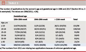 Results: The total number of applications for late termination of pregnancy has increased by 45% from 1986 to 2011 with 594 and 862 applications, respectively. Despite this increase, the number of permissions granted with reference to the women’s conditions has decreased. In 1986 and 2011, 488 and 382 women, respectively, applied for late termination of pregnancy with reference to the women’s conditions. Of the 519 women who were granted permission in 1986, 31% were ≤ 20 years of age. In 2011 this age group represented only 12%.