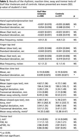 Material and methods: A cross-sectional study of 686 subjects who had been deployed in the Persian Gulf within the period August 2, 1990 until December 31, 1997; the control group comprised 231 subjects matched according to age, gender and profession. All participants underwent clinical and paraclinical examinations, along with a neuromotor test battery (CATSYS Test System®) and a psychological health status questionnaire, the SCL-90-R rating scale.