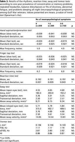 Table 3 shows the association between CATSYS results and the neuropsychological symptoms which clustered significantly more frequently among GW veterans compared with controls; 25 of 26 test results were not significant, and the one result showing a significant trend represented only small differences between the groups.