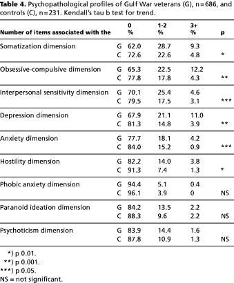 Results.: No differences were found between GW veterans and controls with respect to lifestyle and cohabitational characteristics. Differences between the two groups with respect to neuromotor function were very small. Within the GW veteran group, stratified according to clustering of neuropsychological symptoms, and stratified according to SCL-90-R score, no trends were found suggesting reduced motor function with increasing symptoms. Of nine dimensions constructed on the basis of the SCL-90-R items, six were significantly associated with being a Gulf War veteran. Statistically, the strongest associations were found for ratings of the obsessive-compulsive dimension and of the depression dimension. No associations were found with respect to phobic anxiety, paranoid ideation, and psychoticism.
