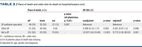 Patients were divided into three groups based on which doctor was responsible in the palliative phase. Odds ratio for death in hospital/hospice was found to be lower for the group of other GPs than for the GP palliative specialist, also after adjusting for patients’ age, gender and diagnosis (Table 2); however, this difference was not statistically significant. The palliative GP had more cancer patients than the group of other GPs (22% versus 16%). If no GP was involved, the adjusted odds were nine times higher for death in hospital/hospice (p < 0.001) than if the GP had been primarily responsible for the palliative trajectory.