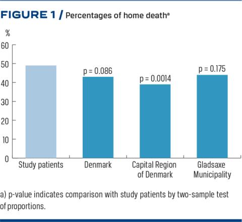 The finding of an increased home-death rate in the study compared with regional data is in accordance with previous findings showing that the propensity among GPs to pay home visits and to be actively involved and accessible in palliative disease trajectories is associated with an increased home-death rate. [11-13]