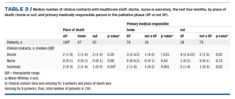 Regarding the number of clinical contacts with the healthcare staff at the practice (doctors, nurses, secretaries), both doctors and secretaries had significantly more contacts with the patient when a GP was the primary medically responsible person. However, there was no overall difference in the number of clinical contacts with the doctor between patients who died at home and in hospital/hospice (Table 3).