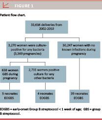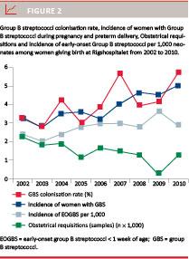 Results: In our cohort, a total of 638 (3.8%) women were diagnosed with GBS, 517 (81%) from urine, 92 (14%) from vaginal swabs and 29 (5%) from both. The overall rate of women colonised with GBS rose from 3.3% in 2002 to 5.1% in 2010 (p < 0.0001). A total of 48 infants had early-onset group B streptococcus (EOGBS), 1.4 per 1,000 neonates in the general population and 7.8 per 1,000 among women with GBS (p < 0.0001).