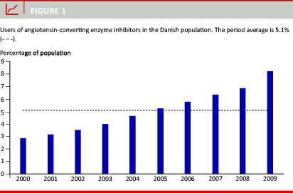 Further indications for ACEI therapy have been added over the past decade, including congestive heart failure, coronary artery disease and diabetic nephropathy. This has resulted in a dramatic growth in its use which has increased from 2.9% of the total Danish population in 2000 to 8.2% in 2009, as shown in Figure 1 [6, 7].