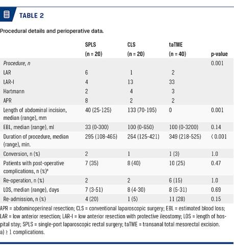 The median operative time was significantly longer in the taTME group (p < 0.001). The rate of post-operative complications was comparable between the three groups (Table 3). However, post-operative urinary retention and re-admissions occurred more frequently in the taTME group. Two patients died in the SPLS group: an 86-year-old American Society of Anesthesiologists III patient died on the 39th post-operative day due to severe pulmonary oedema, and an 83-year-old female patient with an uneventful post-operative course was found dead at home one week after her hospital discharge. There was no mortality in the taTME and CLS group.