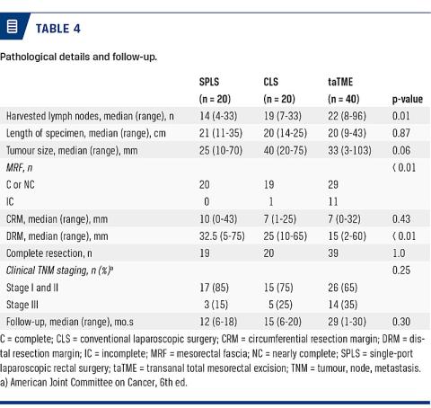 RESULTS: A total of 40 patients were included in taTME, 20 patients in CLS and 20 in SPLS. Patients’ demographics (except for clinical staging), R0 resection and post-operative complication rates were comparable. The length of abdominal incisio-n was significantly lower by taTME than by both SPLS and CLS (p < 0.001). Distant resection margin was shorter in the taTME group (p < 0.01), and the quality of specimen differed between groups (p < 0.01). CRP and WBC increased significantly in each group (p < 0.05), but there was no difference between the groups.