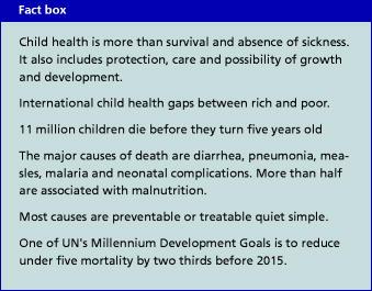 Child health has increased globally. Improved health strategies, including IMCI, implementing basic interventions as vaccination, micronutrients, oral dehydration and antibiotics have contributed. But 11 million children still die every year before they turn five years. Most of malnutrition and a handful of infectious diseases we could prevent or treat efficiently quite simple. There are major geographical differences and poverty is an important risk factor. One of UN's developmental goals is the promise of reducing child mortality significantly, which demands commitment, finance, competent human resources and adapted healthcare systems. But child health is more than survival and absence of sickness; it includes care, growth and development. ( Box 1 )
