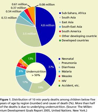 Of the ten million deaths among children below five years of age each year ( Figure 1 ), only 42 countries account for more than 90%. If 20 simple, feasible and cheap interventions with documented effects could reach all children, then more than 60% of the deaths could be avoided [8]. These interventions include nutrition interventions, such as: improved breast feeding, improved complementary feeding, as well as preventive and therapeutic vitamin A and zinc supplementation. Together, these nutritional interventions could prevent 30% of these deaths [8]. Promotion of breast feeding is impaired by the risk of mother-to-child HIV transmission. However, data suggest that HIV in the milk rarely infects the infant through exclusive breast feeding, but mainly through mixed feeding, where foreign proteins or bacteria cause mucosal lesions which can be a port of entry for the virus. Women with HIV infection are therefore recommended to use exclusive breast feeding and fast cessation when safe alternatives become available.