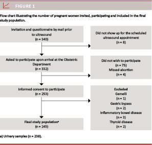 We conducted a cross-sectional study between 13 June and 10 August 2012 in an area of Denmark with previously moderate iodine deficiency [8]. We consecutively recruited healthy, pregnant women referred to Aalborg University Hospital for obstetric ultrasound as part of the antenatal investigation programme [14]. Two of the pregnant women were excluded (Figure 1), because they had a diagnosis of hypothyroidism and took levothyroxin replacement therapy at the time of enrollment. None of the remaining women had a history of thyroid disease verified by a doctor.
