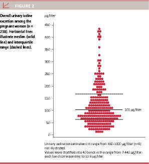 Urinary iodine excretion is a recommended marker of recent iodine intake [4], and spot urine samples can be used in population studies [17]. The relatively large number of pregnant women included in our study increased the precision of the estimated iodine excretion [18]. However, the number of pregnant women in the stratified analyses was limited in some groups.
