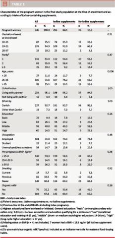 Conclusion: The majority of pregnant women took iodine-containing supplements, but the subgroup of non-users was still iodine-deficient after the introduction of iodine fortification of salt. Iodine supplement intake during pregnancy in Denmark should be officially recommended.