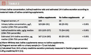 Thus, our results indicate that the median urinary iodine concentration has increased in pregnant women with no iodine supplement intake, which corresponds to the general increase in the median urinary iodine concentration after the introduction of iodine fortification of salt in Denmark [9]. However, pregnant women with no intake of iodine-containing supplements still have urinary iodine concentrations substantially below the recommended level for pregnancy [4] and even below the recommended range for the non-pregnant state [4].
