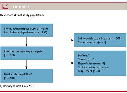From the digital patient registration system we identified all pregnant women booked for ultrasound assessment in their first, second and third trimesters. We primarily excluded gemelli pregnancies and pregnant women assigned for control of comorbidities including thyroid disease. Included women (Figure 1) were informed about the project in the waiting room when they showed up for the ultrasonography session. After information was given, the women were invited to sign a consent form and fill in a questionnaire concerning socio-demographic issues, obstetric history, smoking habits and information on intake of iodine containing food sources (milk, bread, fish) and vitamin supplements. The information about vitamins was further elaborated in a short interview. The women were not informed about the fortification and monitoring programme on iodine in Denmark prior to their participation. When language barriers were observed, the entire questionnaire was translated verbally into English. At the end of session, the women provided a urine sample.