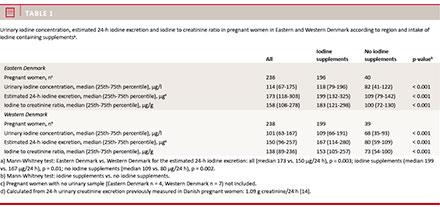 Regional differences in iodine concentrations in Denmark are well-documented and are due to different levels of iodine in the drinking water [18]. A similar regional difference was found among pregnant women, with the highest iodine concentrations being measured in Eastern Denmark. Nonetheless, pregnant Danish women with no intake of iodine-containing supplements were at particular risk of iodine deficiency.