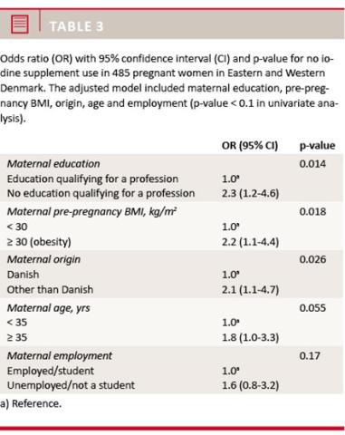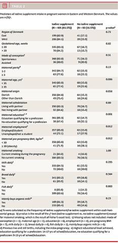 Results: The pregnant women from Eastern Denmark had a median age of 30 years and the median gestational week at which they were included in the study was week 19. The majority took iodine-containing supplements (86%). The median UIC was 118 (interquartile range (IQR): 79-196) µg/l in iodine supplement users and 82 (IQR: 41-122) µg/l in non-users (p < 0.001). Predictors of not using iodine supplement in Eastern and Western Denmark were short maternal education, non-Danish origin and pre-pregnancy obesity.