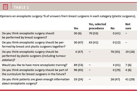 Results: The questionnaire was sent to 50 breast surgeons and 22 plastic surgeons; the response rate was 67%. All breast surgery units had an established cooperation with plastic surgeons. Most breast surgeons used unilateral displacement techniques; plastic surgeons also included breast reduction techniques and replacement with local flaps. Almost all symmetrisation procedures were performed by plastic surgeons. Breast surgeons had sought more specific education, both international observerships and specific courses. In both groups of surgeons, the majority expressed that both tumour removal and reconstruction should be performed by doctors of their own specialty.