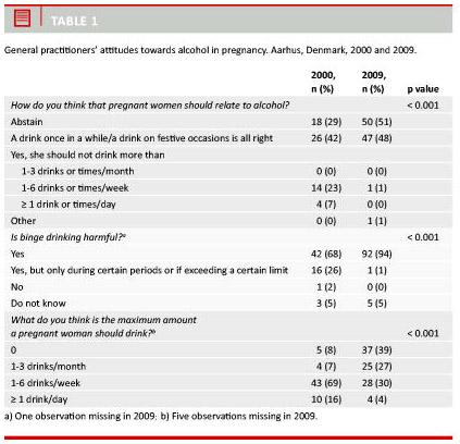 Introduction: Many pregnant women in Denmark have been advised that some alcohol intake is acceptable. In the 1999-2007-period, the Danish National Board of Health advised pregnant women that some alcohol intake was acceptable. From 2007, alcohol abstinence has been recommended. We aimed to describe the attitudes towards and knowledge about alcohol in pregnancy among general practitioners (GPs) in Denmark in 2000 and in 2009.