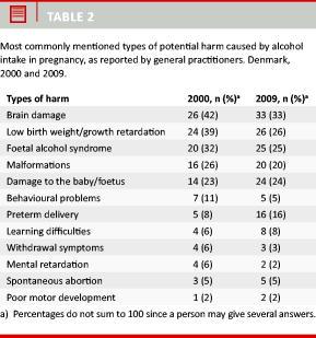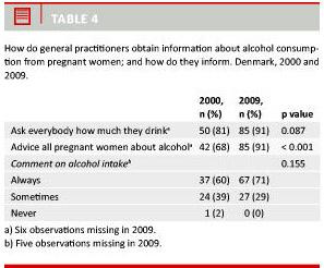 The majority of pregnant Danish women believe that information about alcohol in pregnancy can best be communicated by health personnel [1]. In a previous study, few remembered having talked to their general practitioner (GP) about the issue; and most had been advised that some alcohol intake was all right [1].