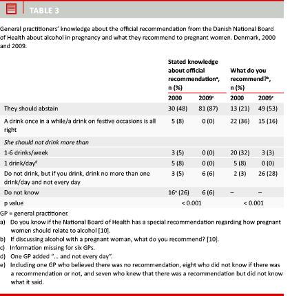 In this study, we describe GPs’ attitudes towards and knowledge about alcohol intake in pregnancy in 2000 and 2009 and how their answers related to the different official recommendations at these two points in time.