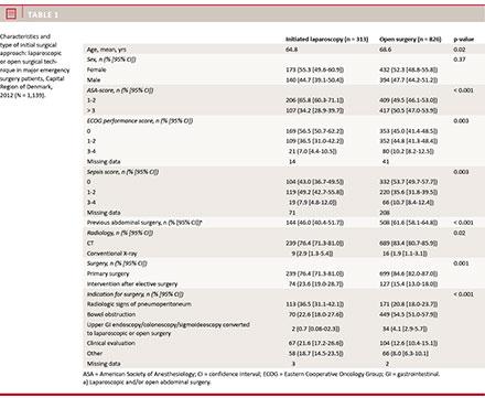 Patients with an initial attempt of laparoscopic surgery were younger, had a lower ASA score and a lower frequency of previous abdominal surgery than patients who had an initial laparotomy. More patients in the initial laparoscopy group were operated for free air on radiological examination or based on a clinical evaluation alone, while operation for bowel obstruction was more frequent in initial laparotomy patients (Table 1).