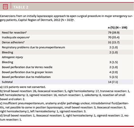 The conversion rate in other studies of laparoscopic abdominal emergency surgery varied from 0.16% to 55%, depending on the studies’ inclusion criteria. Studies in which cholecystectomies and appendectomies are included generally have a low conversion rate compared with studies including only perforated peptic ulcer or SBO [1, 3-5, 10, 13, 14]. In our study, the high 60% conversion rate reflects the patient material, but this probably constitutes a realistic estimate in a high-risk population.