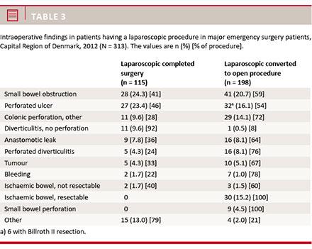 More than 50% of the procedures for perforated ulcer that did not require resection and more than 40% of the procedures for SBO were completed laparoscopically. Almost all procedures for non-perforated diverticulitis and more than a third of the procedures for anastomotic leak were also completed laparoscopically (Table 3).