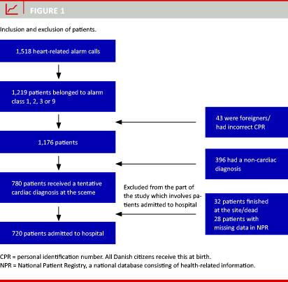 Exclusion criteria: A total of 43 patients were foreigners or had an incorrectly listed personal identification number (CPR number). This resulted in 1,176 included dispatches. A total of 396 patients were excluded as the physician on the scene did not assign a provisional cardiac diagnosis. In all, 29 patients were allocated to alarm class 1. This group was treated on the scene and not admitted to a hospital. Since one of the aims was to compare the tentative diagnosis by the MECU with the primary discharge diagnosis, these cases were excluded from the study. A review of the data from the NPR showed that six patients from alarm class 1 were taken to a hospital and admitted. We assume that there was an error in the registration of the alarm classification for these six patients and they were therefore included in the study. Nine patients were categorized into alarm class nine and pronounced dead on the scene. These patients were excluded because they were not admitted and treated.