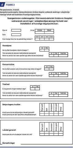 A questionnaire specifically designed for this pilot study was created in cooperation with environmental consultant Kim Mikiki Paris from the Department of Human Resources and Working Environment, Hvidovre Hospital. The content of the questionnaire was based on questions used in Danish surveys on working conditions, Figure 2. The key points included in the questionnaire were the perception of lighting conditions at the desk and when looking at patients in the room, as well as the overall experience of being in the room. These questions could be answered along a