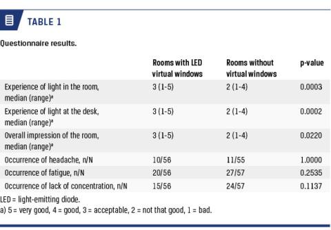 RESULTS: A total of 113 questionnaires were collected and evaluated. LED virtual windows produced an improved perception of lighting conditions, both at the desk (p < 0.001) and in the rooms in general (p < 0.001) and improved the overall positive experience of the rooms (p = 0.02). A tendency towards concentration difficulties was reported less often in the rooms with LED virtual windows, (p = 0.11). Retinal illuminance (p = 0.02) as well as CCT at the desk (p < 0.005) and at the retina (p < 0.01) alike were increased in rooms with LED virtual windows.