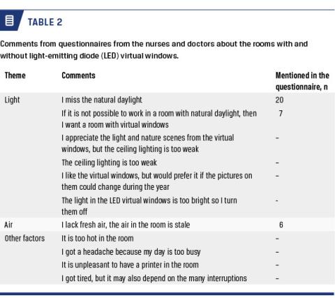 From the Comments section of the questionnaire, it appeared that the medical staff were unhappy with the windowless rooms, but quite often wrote that the LED virtual windows were part of the reason why they experienced the room in a positive way. Some, however, wanted the natural scene to change in accordance with the time of year. It was also noted that some participants lacked fresh air and that the temperature of the room and emissions from the printer had a negative impact on the overall experience of the rooms, Table 2.