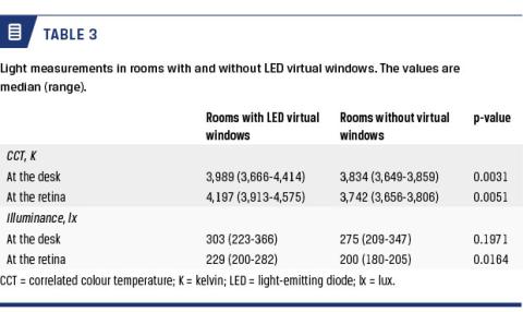 Lighting results from the rooms fitted with LED virtual windows were compared to lighting results from the rooms without LED virtual windows.