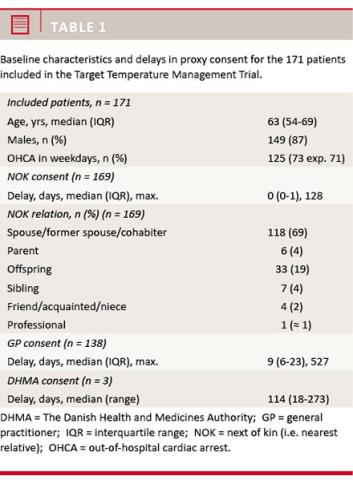 Methods: In a prospective study, 171 comatose out-of-hospital cardiac arrest (OHCA) patients were randomised to targeted temperature management. Patients were randomised before NOK could be informed, and proxy consent was obtained as soon as possible. Written consent from NOK and GP were our study data.