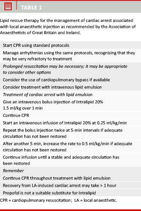 A growing number of case reports and animal studies suggest that intravenous lipid emulsion (ILE) such as Intralipid can be used as an antidote in the resuscitation of patients with cardiovascular collapse due to an overdose of local anaesthetics or lipophilic non-local anaesthetic drugs [1-6]. The term lipid rescue therapy is used internationally for ILE treatment during resuscitation. The Association of Anaesthetists of Great Britain and Ireland (AAGBI) published treatment guidelines in 2007 on the use of local anaesthetic systemic toxicity (LAST). These guidelines state that ILE should be immediately available in all areas where potentially cardiotoxic doses of local anaesthetics are given, along with guidelines for its use (Table 1) [7]. The guidelines are relevant, e.g. in departments performing nerve blocks guided by nerve stimulator as well as by ultrasound, intravenous regional block, extensive infiltration with local anaesthetics or epidural anaesthesia.