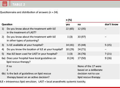 Results: A total of 22 (65%) of the AAs were aware of use of ILE in the management of LAST. One (3%) had knowledge of ILE treatment for non-local anaesthetic-drug poisoning. Eight (24%) had access to local guidelines on lipid rescue therapy. The same eight AAs also knew where to find ILE. None of the hospitals lacking guidelines had taken an active stand against the treatment.