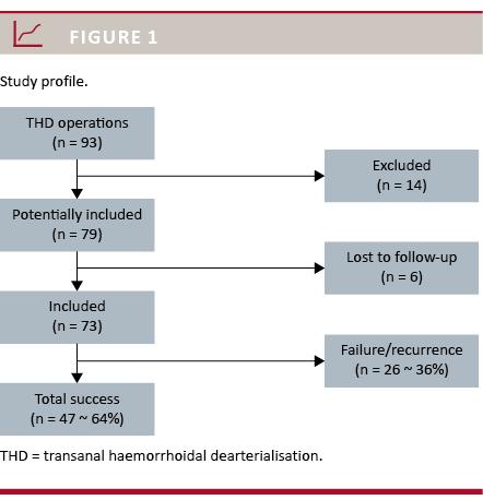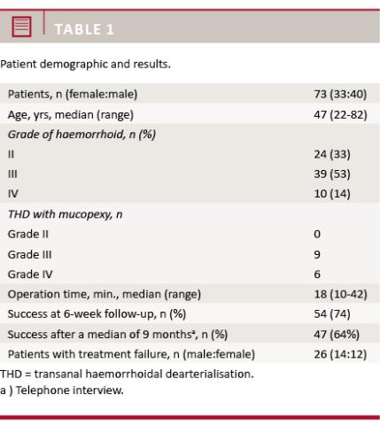 Methods: The study was a single-centre, non-controlled retrospective study that comprised consecutive patients from a two-year period. Prior to the study start, THD was introduced in our surgical department as the standard treatment of Grade III-IV haemorrhoids. All patients were clinically examined 4-6 weeks post-operatively. Additionally, a structured telephone interview was conducted within two years after the THD operation.