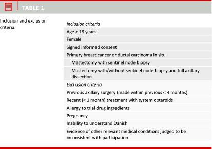 This project aimed to assess whether instillation of methylprednisolonacetate (Depo-Medrol) 80 mg into the cavity at drain removal after mastectomy (Table 1) acts prophylactically against seroma formation.